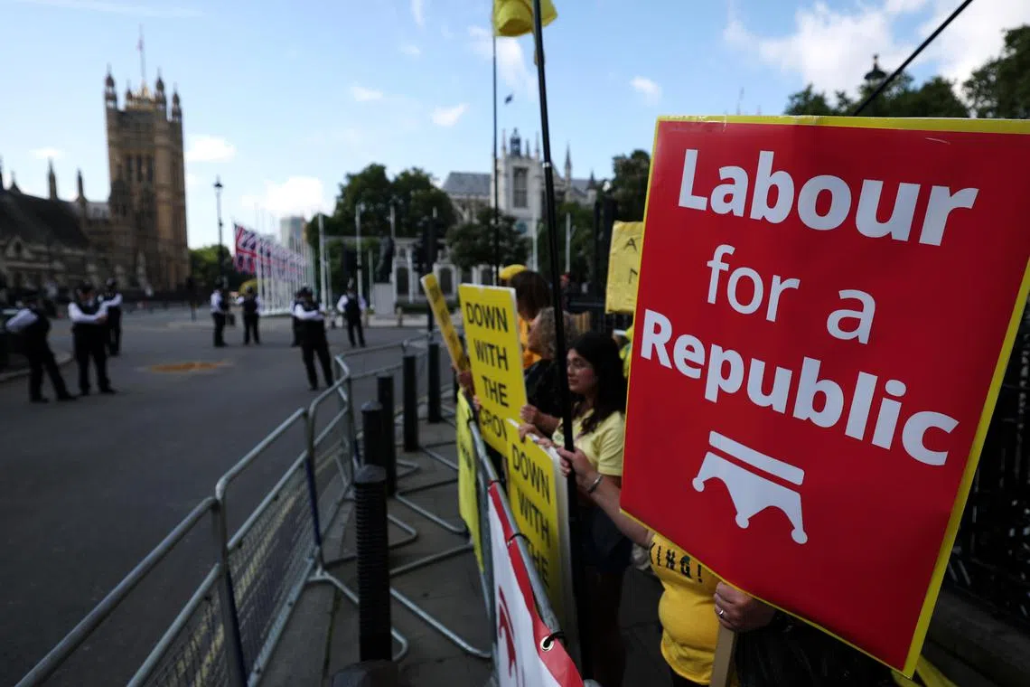 Protesters taking part in an anti-monarchy protest ahead of the state opening of Parliament in London on July 17.