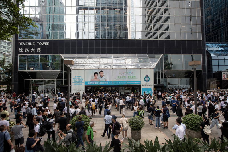 Staff and visitors of the Revenue Tower, a government building, wait outside as protesters occupy the lobby of the building during a protest against an extradition Bill in Hong Kong on June 24, 2019.