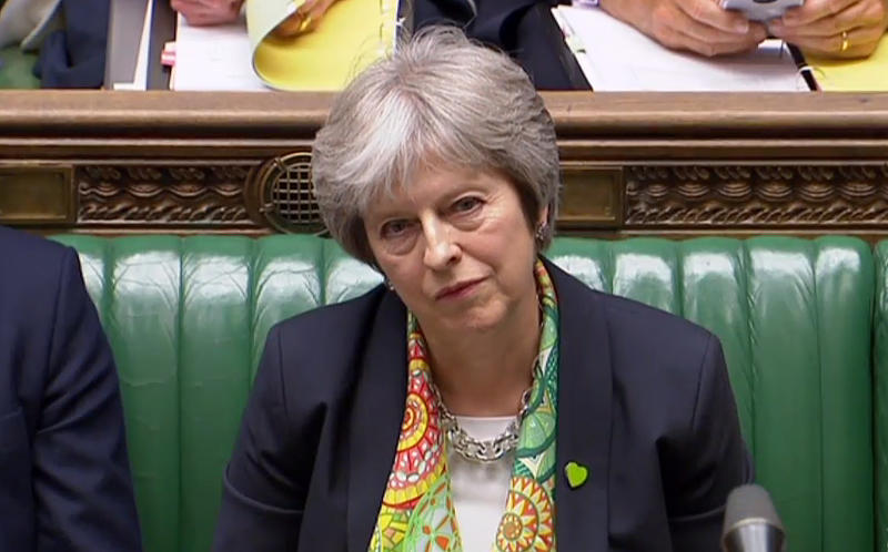 Britain's Prime Minister Theresa May listens to a question while speaking on the G-7 summit, in the House of Commons in London on June 11, 2018.