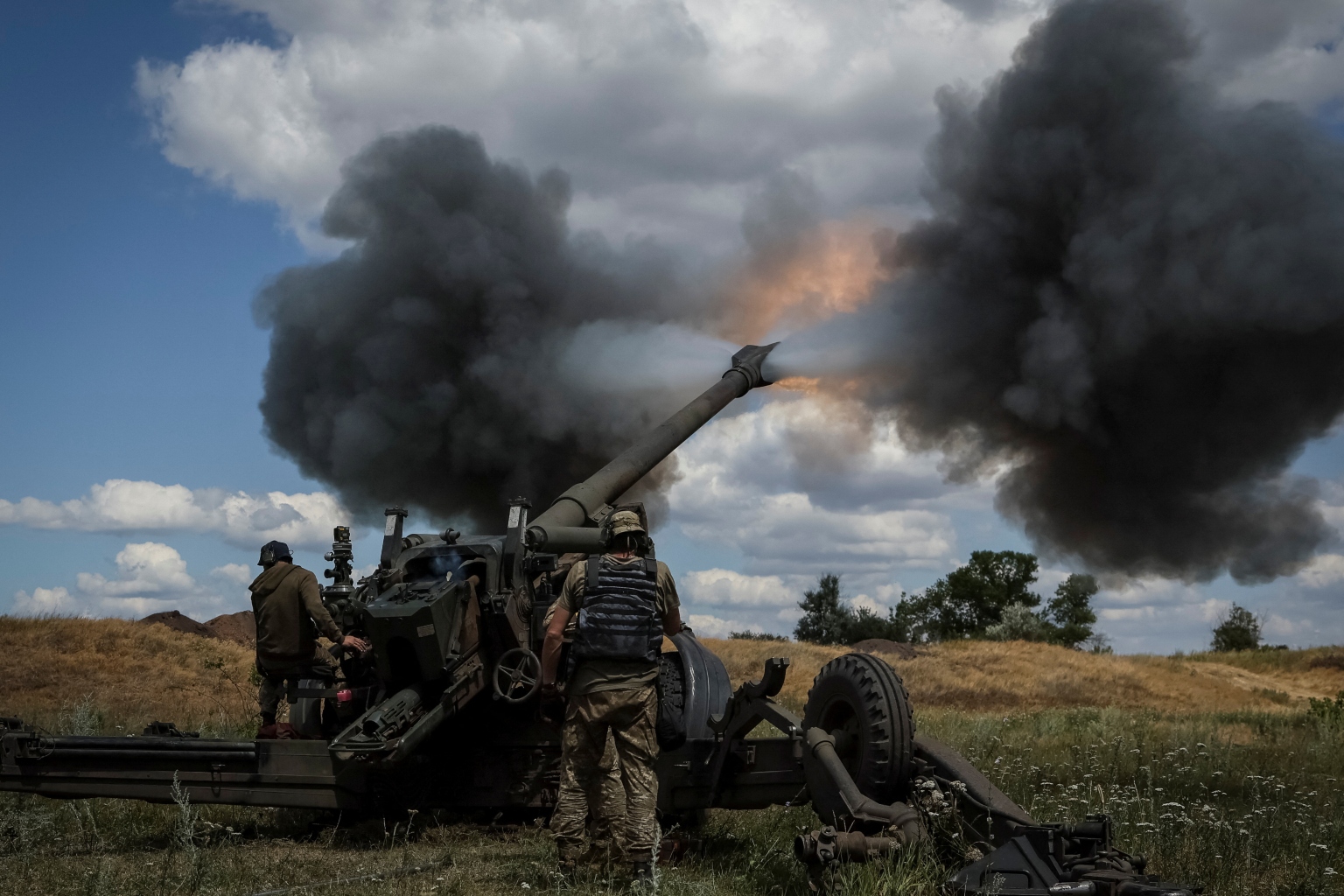 Ukrainian service members fire a shell from a towed howitzer FH-70 at a front line in Donbas Region, Ukraine, on July 18, 2022.