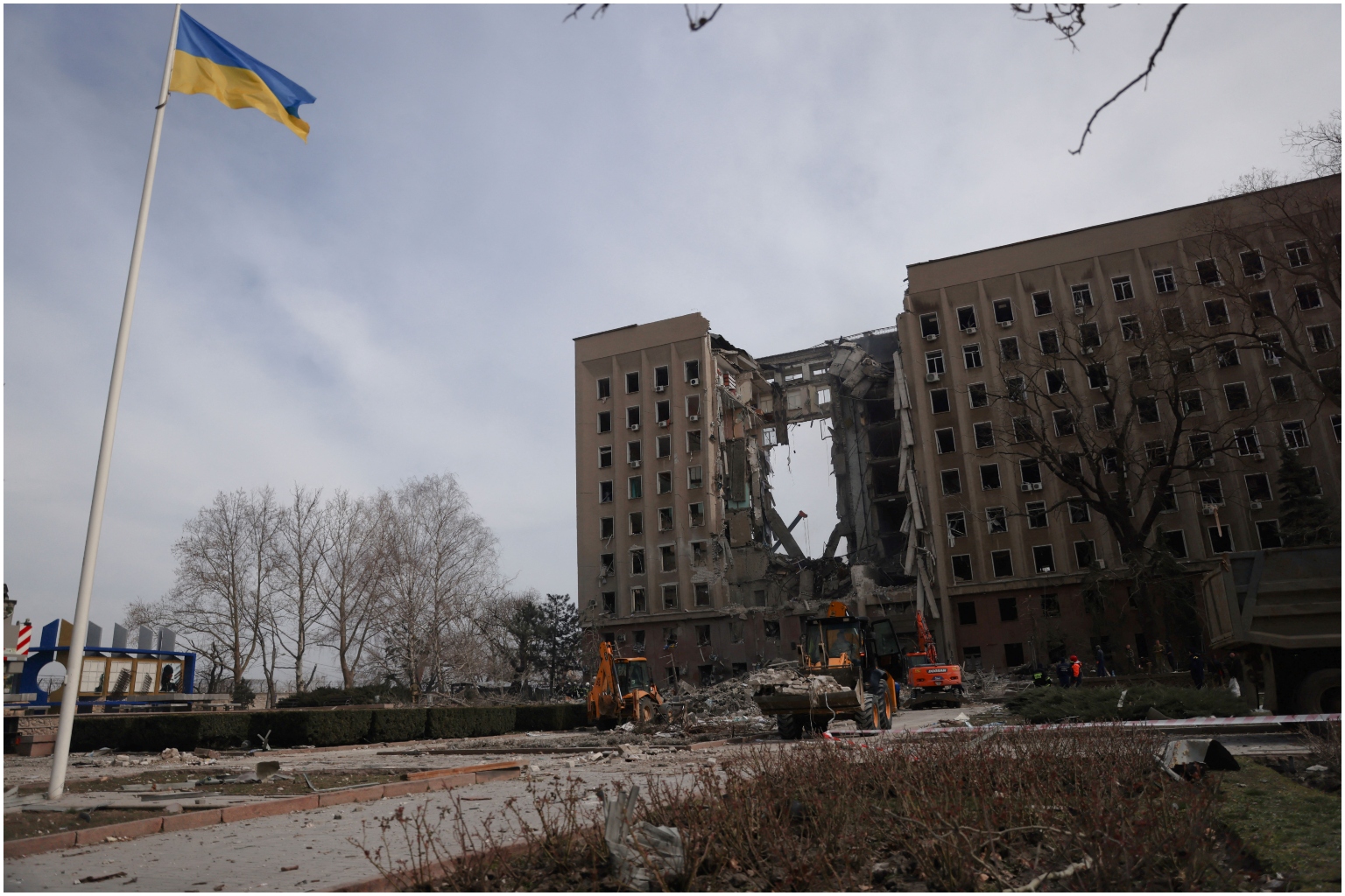 A destroyed Ukrainian government administration building following a bombing, in Mykolaiv, Ukraine, on March 29, 2022.