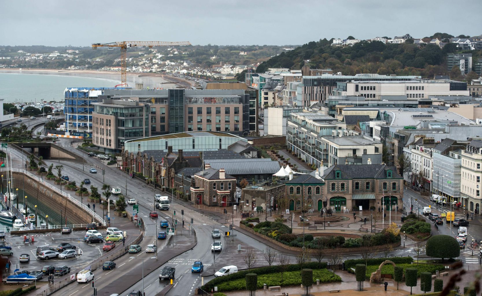 A 2017 photo shows office and residential buildings in St Helier, on the British island of Jersey.