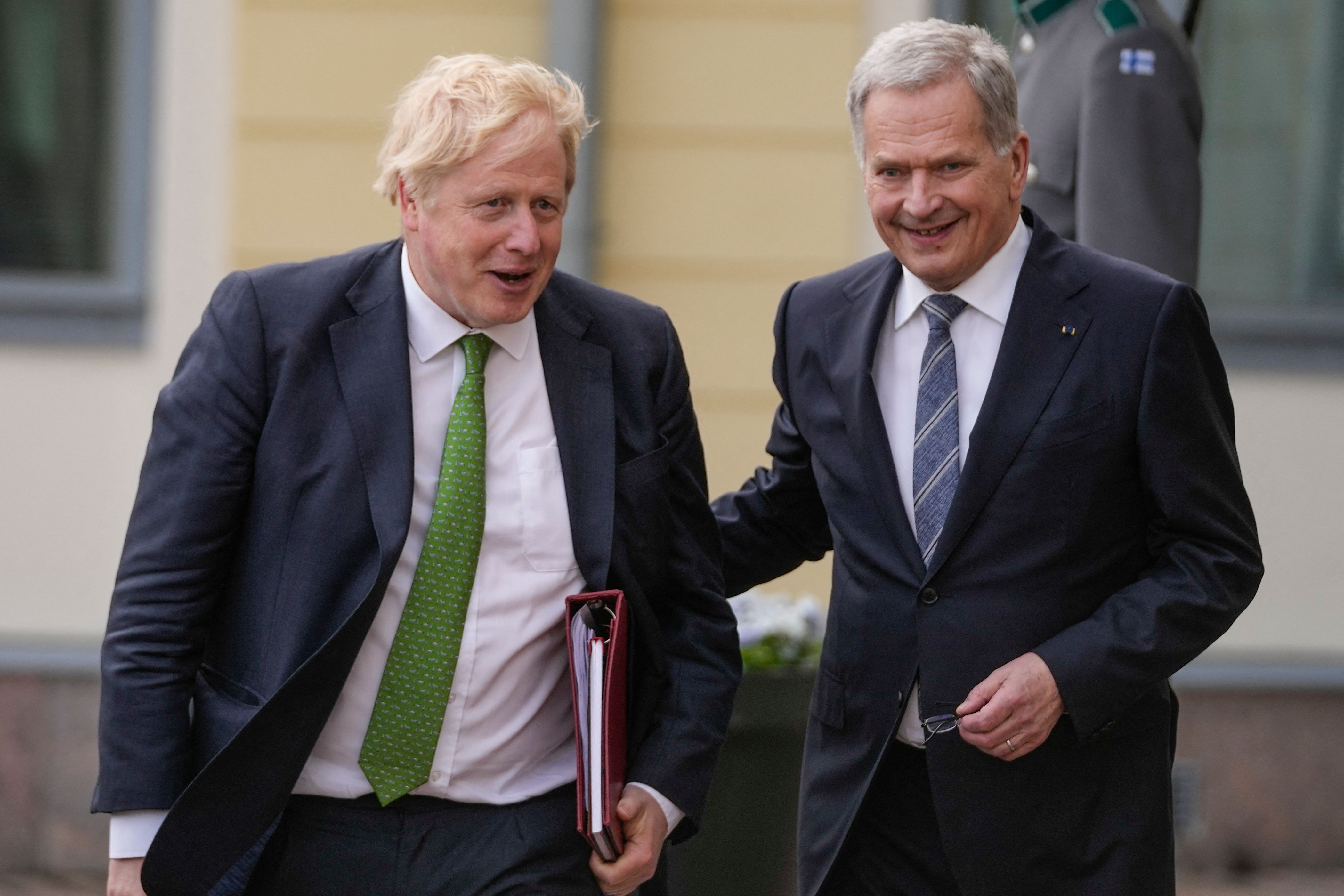 British Prime Minister Boris Johnson is greeted by Finnish President Sauli Niinisto at the presidential palace in Helsinki, on May 11, 2022.