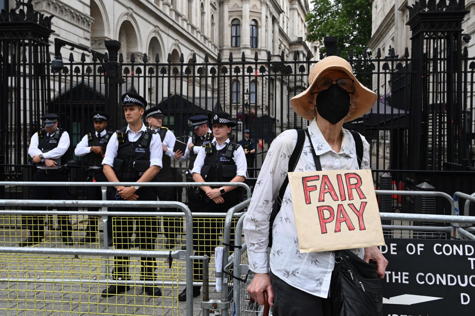 A protester demonstrates outside Downing Street in central London, Britain, on June 18, 2022.