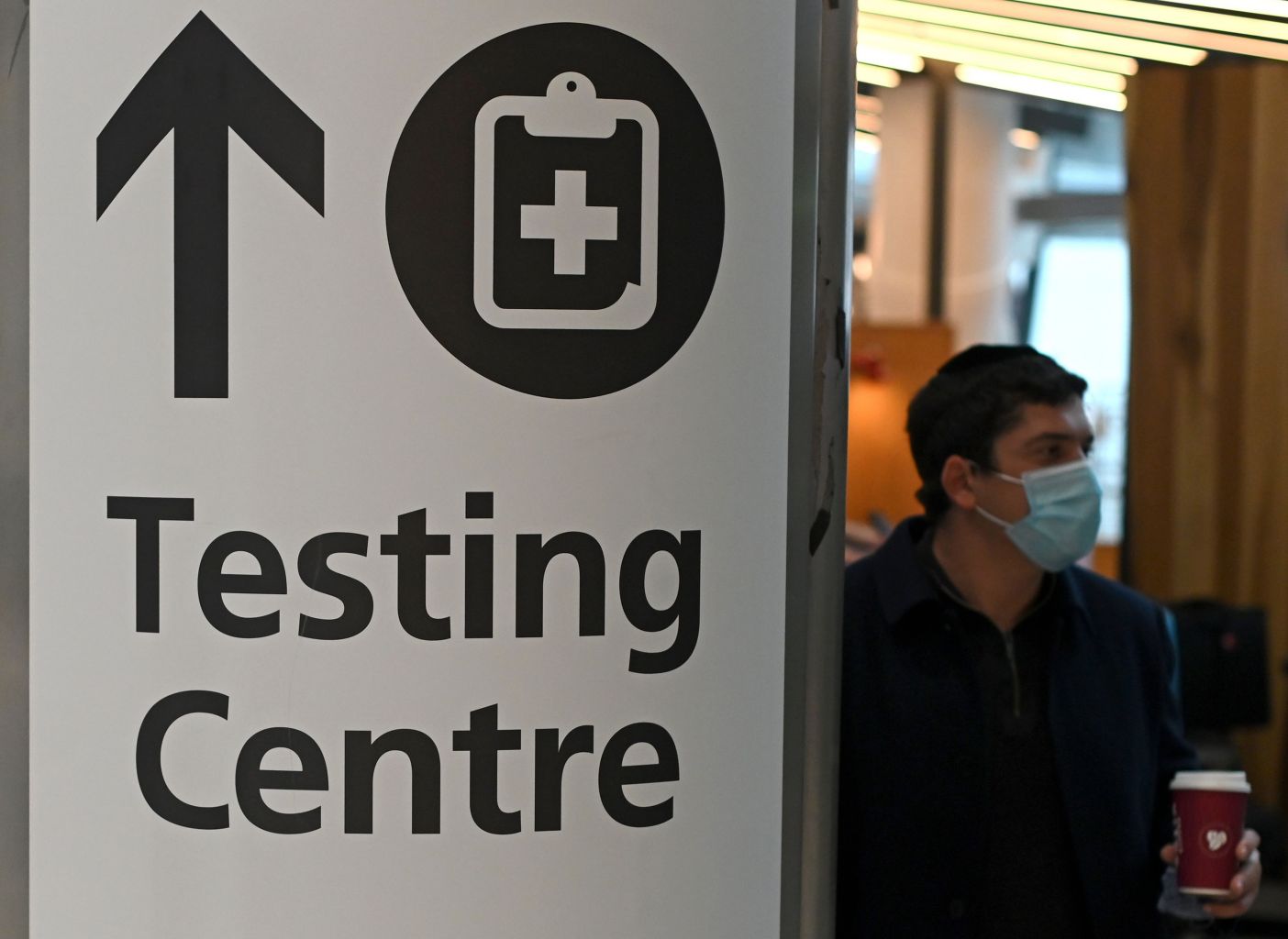 A sign directs passengers to a Covid-19 testing centre at Terminal 5 of London's Heathrow Airport.