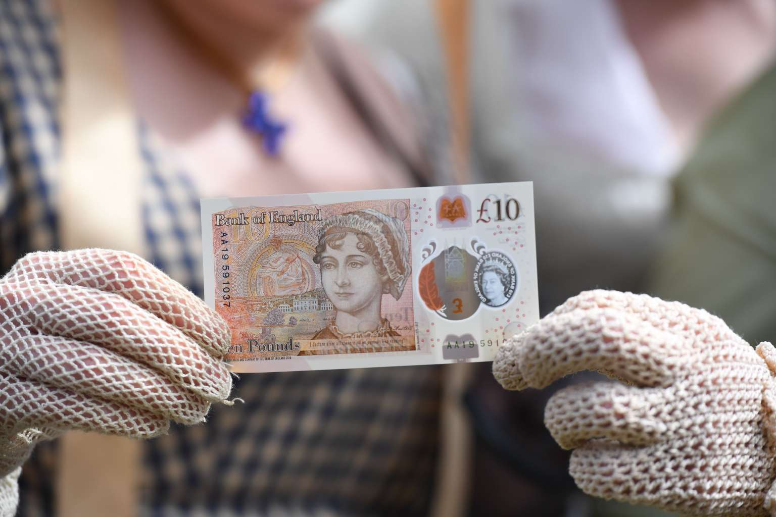 The Bank of England's new ten pound notes, featuring author Jane Austen, at its launch at Winchester Cathedral in Winchester, southern England, on July 18, 2017.