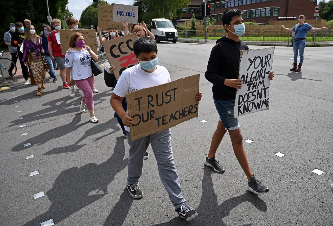 Students protest against the downgrading of A-level results in Codsall, England, on Aug 17, 2020.