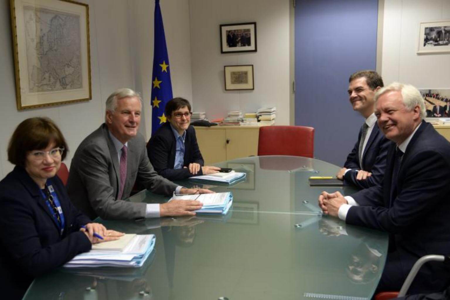 David Davis (right) with European Union Chief Negotiator in charge of Brexit negotiations with Britain Michel Barnier (2- left) during their meeting at the European Union Commission headquarter in Brussels, Belgium, on July 17, 2017.