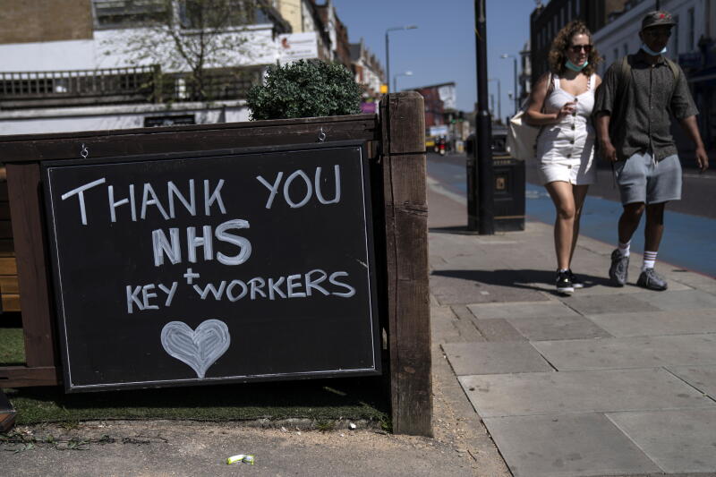 A sign thanking the NHS is seen near Tooting Broadway Market in London.