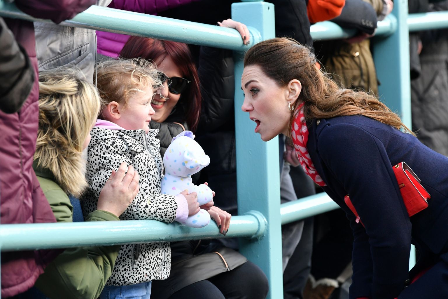 Catherine, Duchess of Cambridge, speaks with a young girl during a visit to a lifeboat station in Wales, Feb 4, 2020.