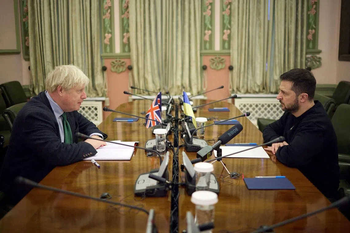 Former British prime minister Boris Johnson (left) during talks in Kyiv with Ukrainian President Volodymyr Zelensky.