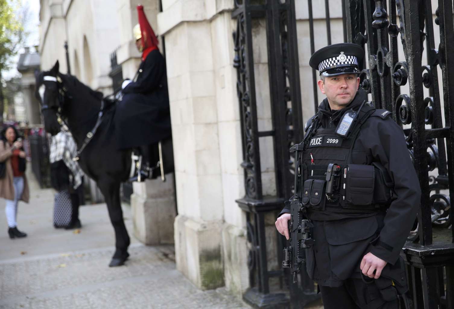 An armed police officer standing outside Horseguards on Whitehall in London on Nov 18.