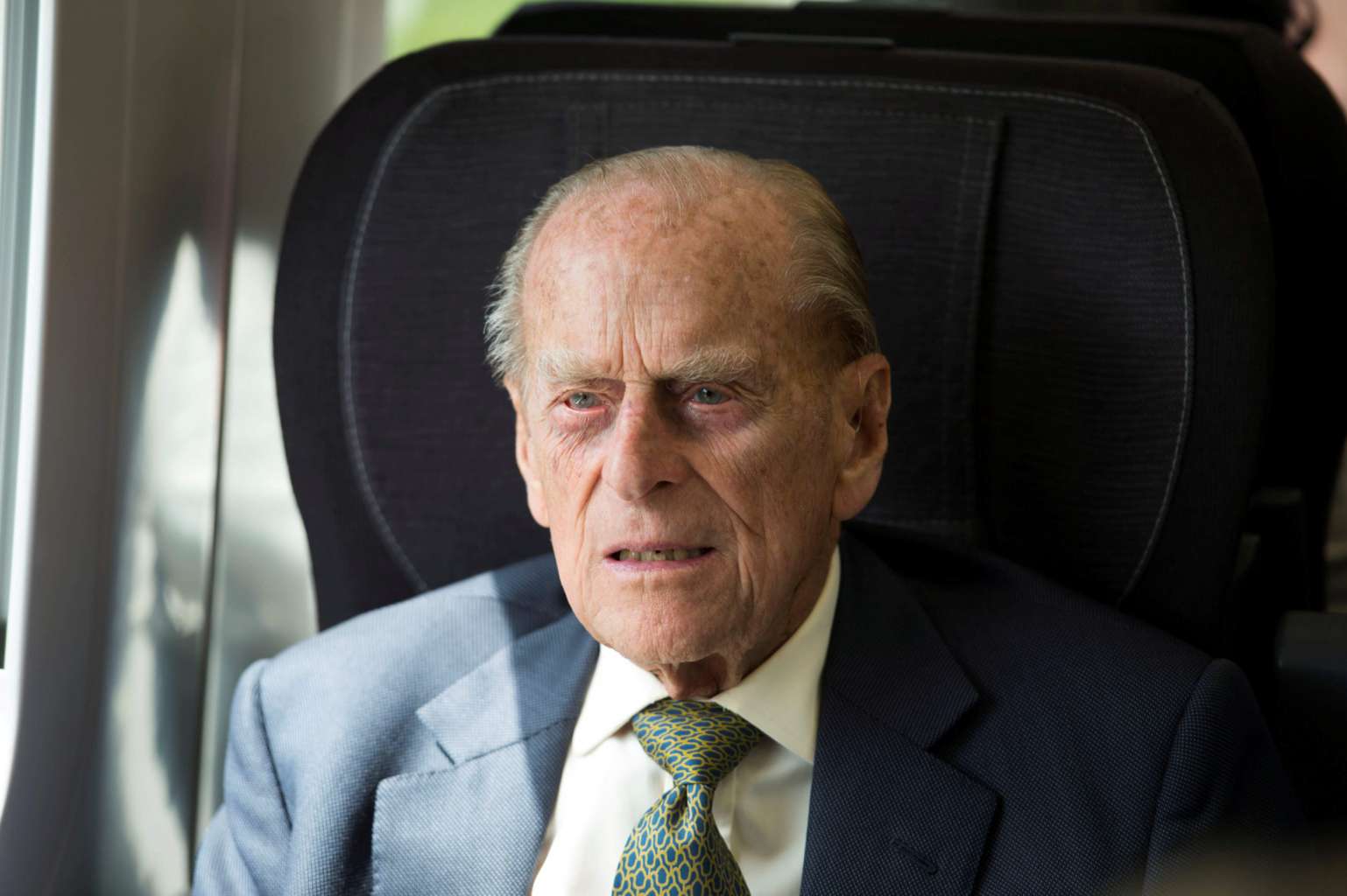 Britain's Prince Philip sits in a train on a journey marking the 175th anniversary of the first train journey by a British monarch, travelling from Slough to London Paddington, Britain on June 13, 2017.