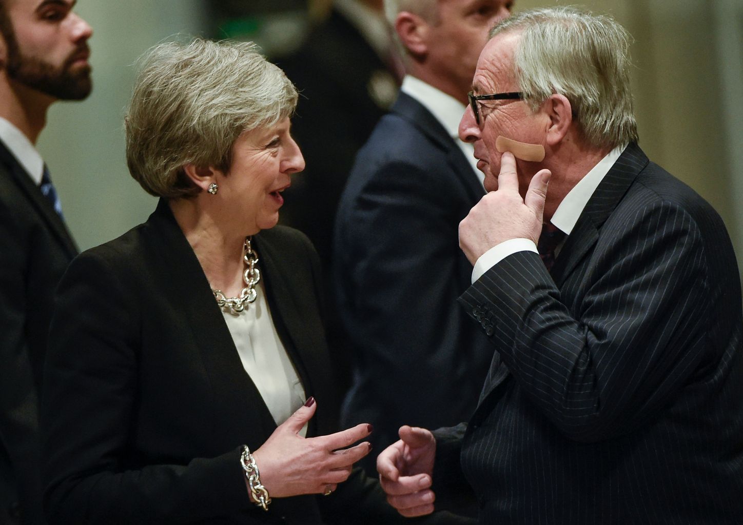 European Commission president Jean-Claude Juncker met British Prime Minister Theresa May in Brussels on Wednesday. He joked that the band-aid visible on his cheek was not her doing.
