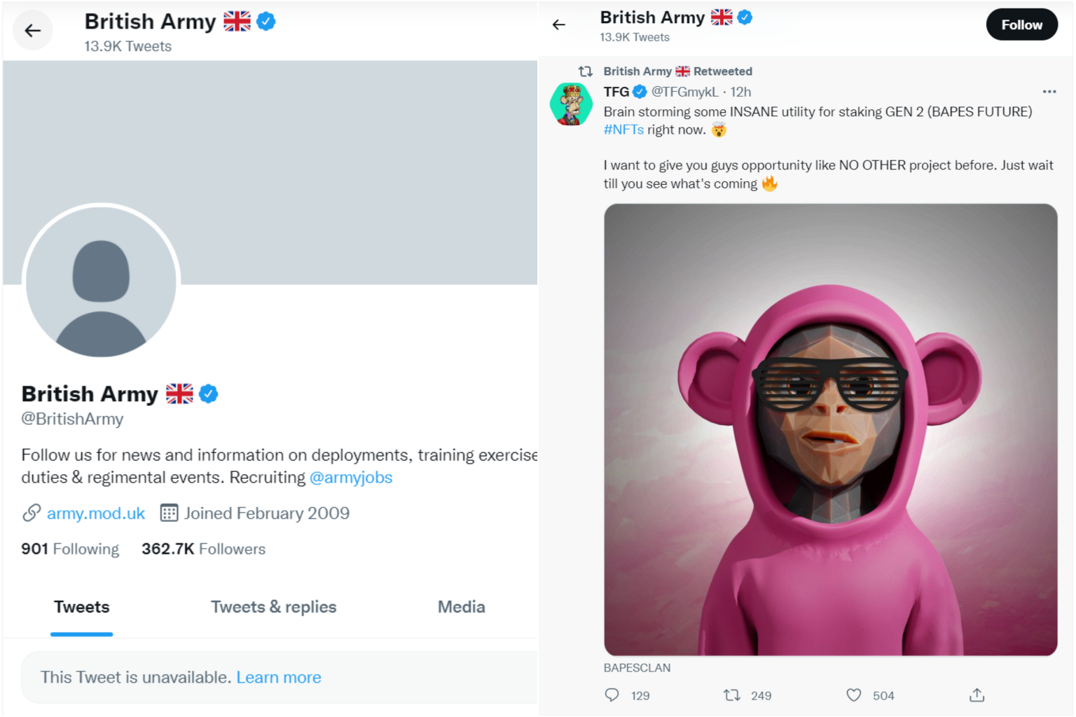 The @BritishArmy handle, which is verified by Twitter, had retweeted a number of posts promoting non-fungible tokens on its timeline.