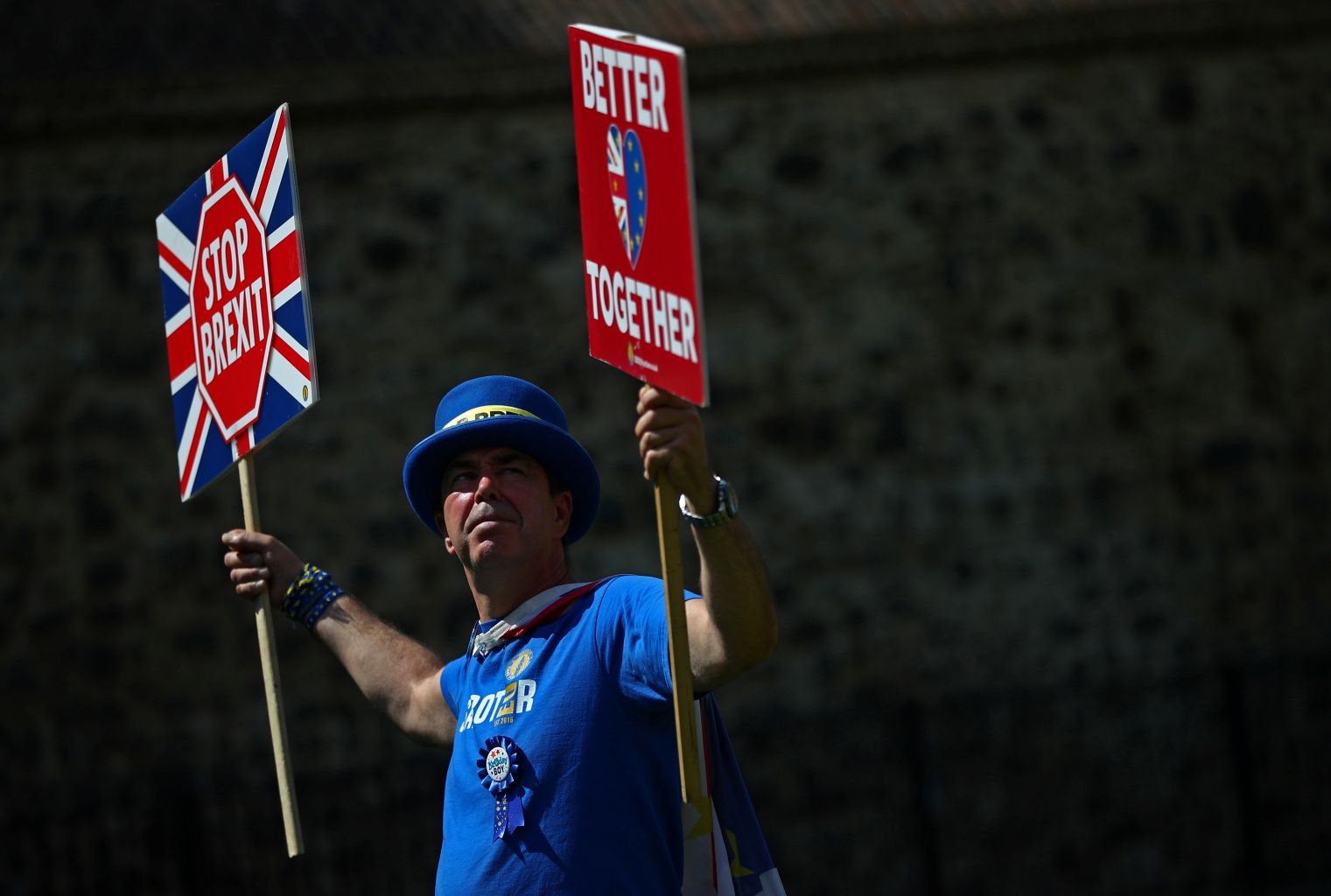 Anti-Brexit protester Steve Bray demonstrates outside the Houses of Parliament in London.