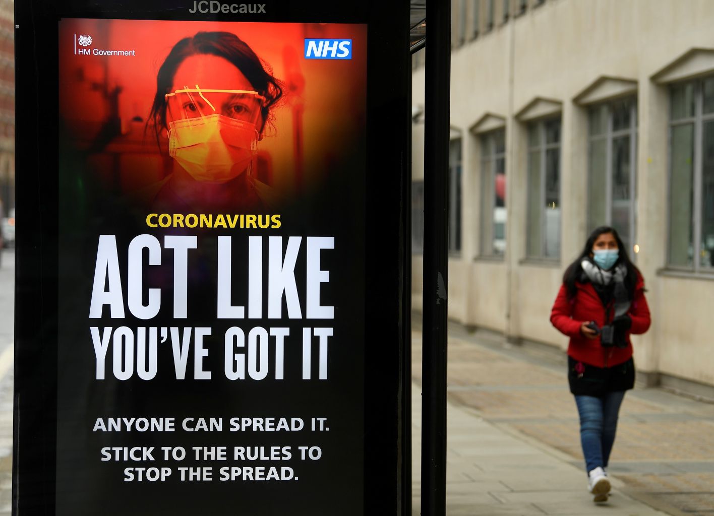 An official public health information poster is seen on a bus shelter in London, Britain, Jan 27, 2021.