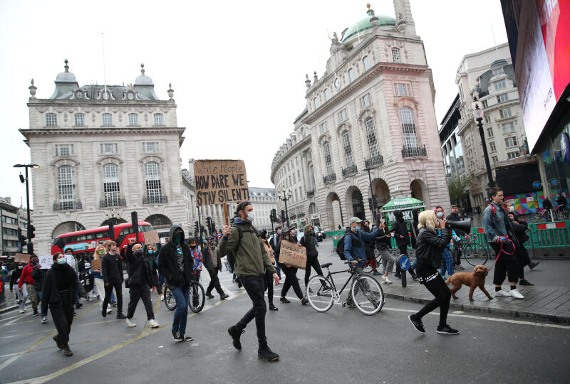People march through Piccadilly Circus during a Black Lives Matter protest in London, on June 10, 2020.