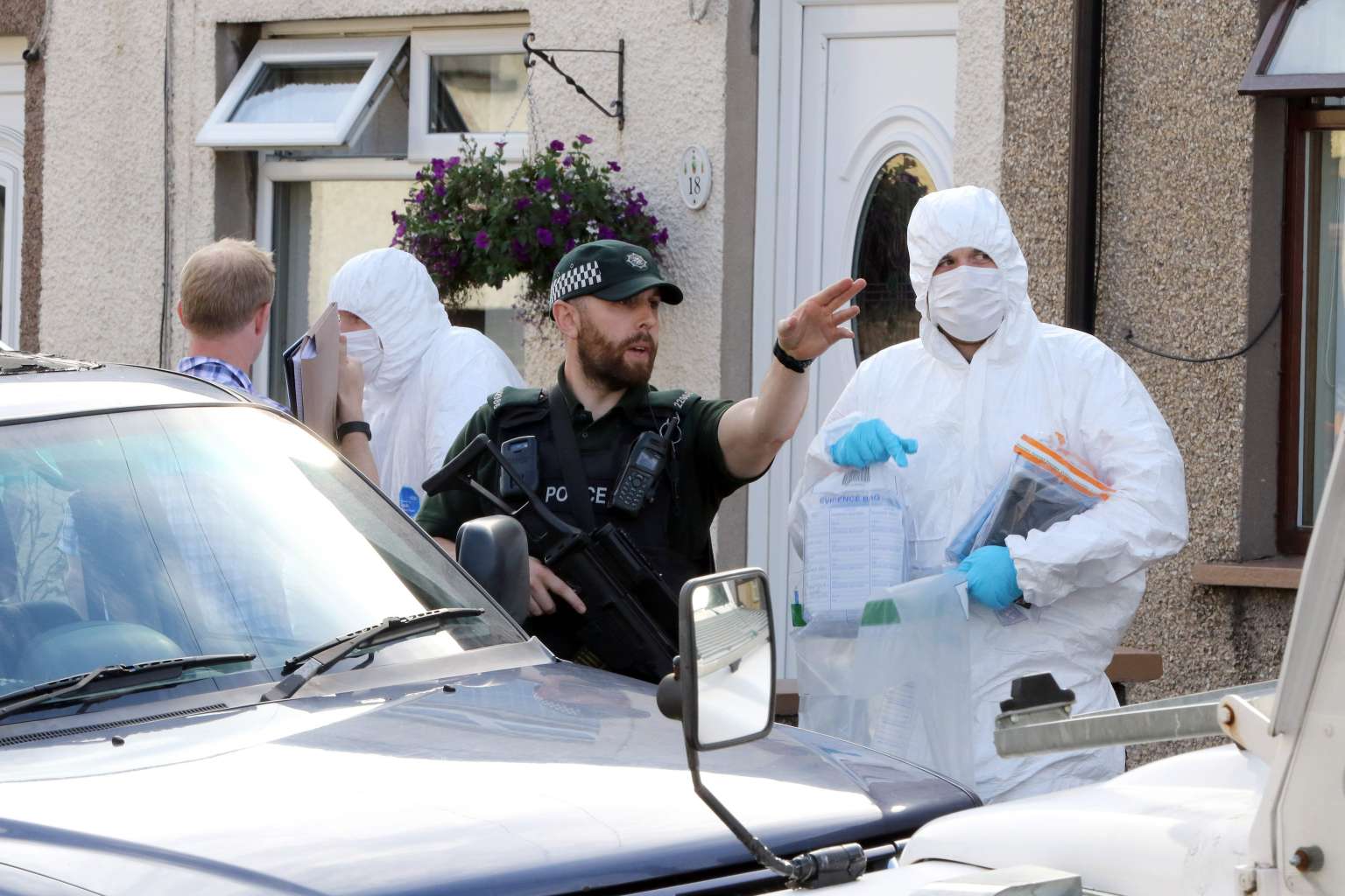 Police forensic officers carry evidence from a residential address in Larne, County Antrim, Northern Ireland, on Aug 24, 2016.