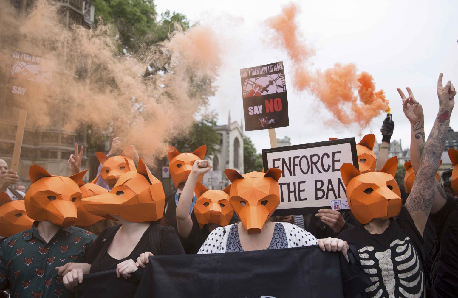 At Tuesday's protest, where demonstrators wearing fox masks, throwing smoke bombs and shouting "fight for the fox" briefly blocked traffic outside parliament, May said the amendment would have made prosecutions all but impossible.