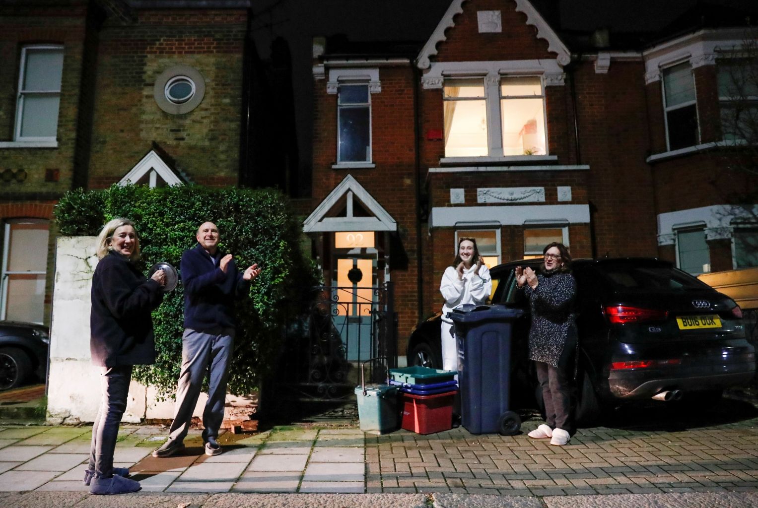 Residents participate in a national clap for late Captain Sir Tom Moore and all NHS workers, in Brentford, London.