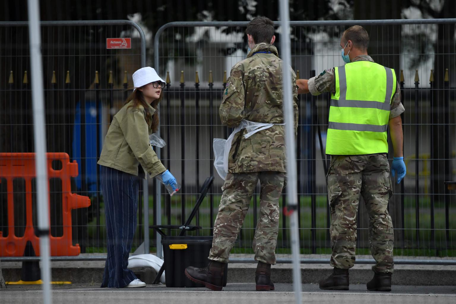 A member of the public puts a used self-test kit into a tub at a mobile Covid-19 testing centre in central England on June 29, 2020.