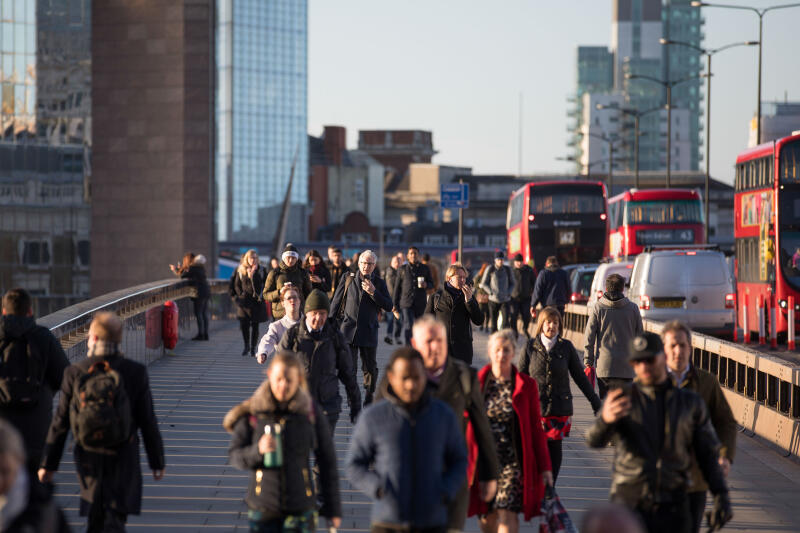Commuters walk across London Bridge during morning rush hour in London, Britain, on March 16, 2020.