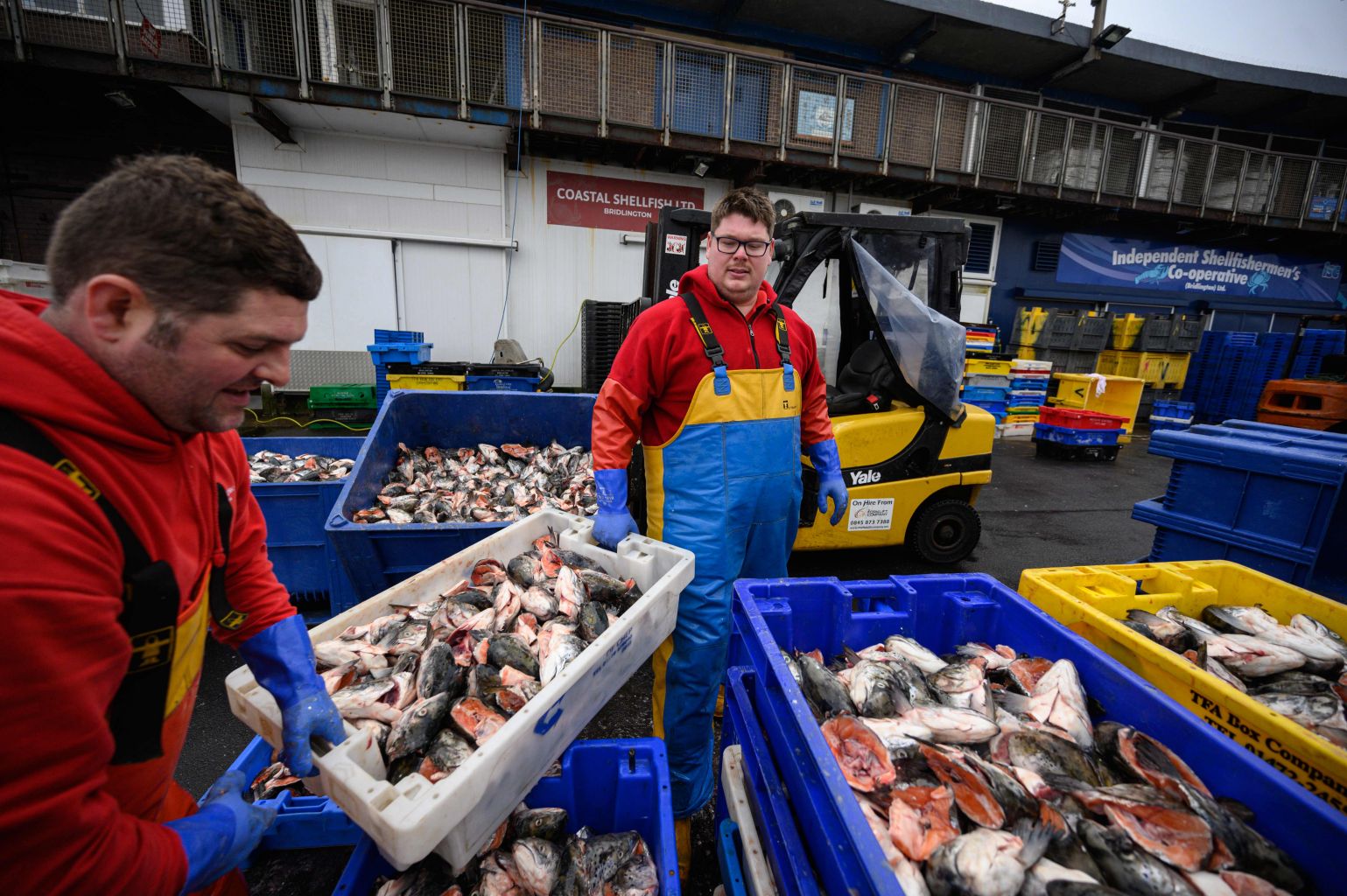 Fishermen sort and load trays of salmon heads to be used as bait for crab and lobster pots in Bridlington, north-east England on Dec 11, 2020.