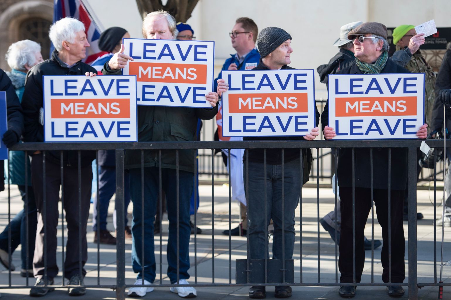 Pro-Brexit activists hold up placards outside the Houses of Parliament in London on Jan 8, 2019.