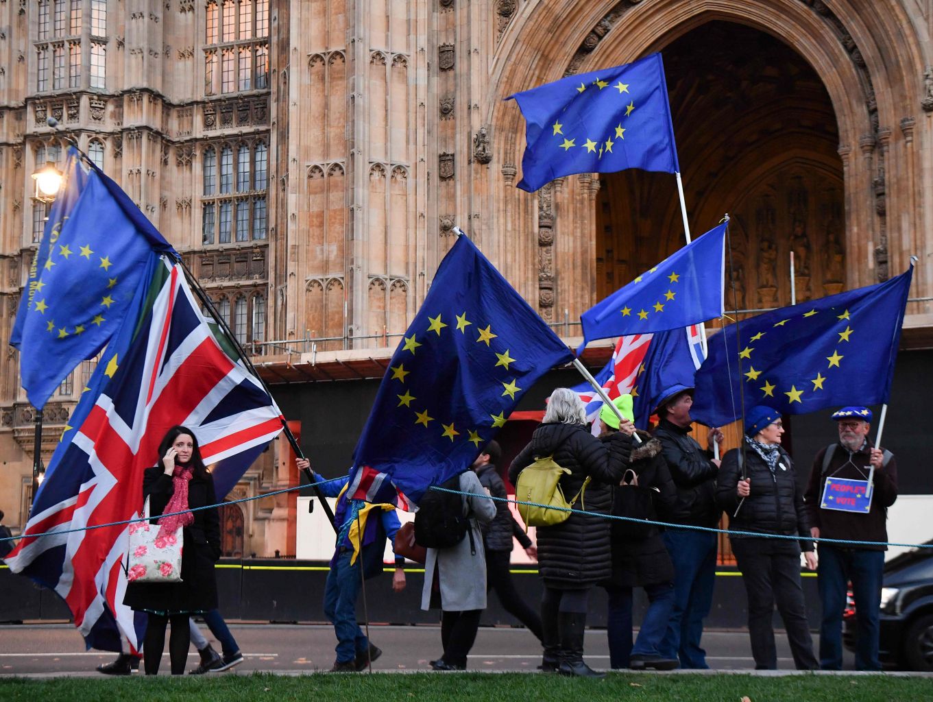 Anti-Brexit campaigners with EU and Union Flags seen near the Houses of Parliament in central London on Nov 15, 2018.