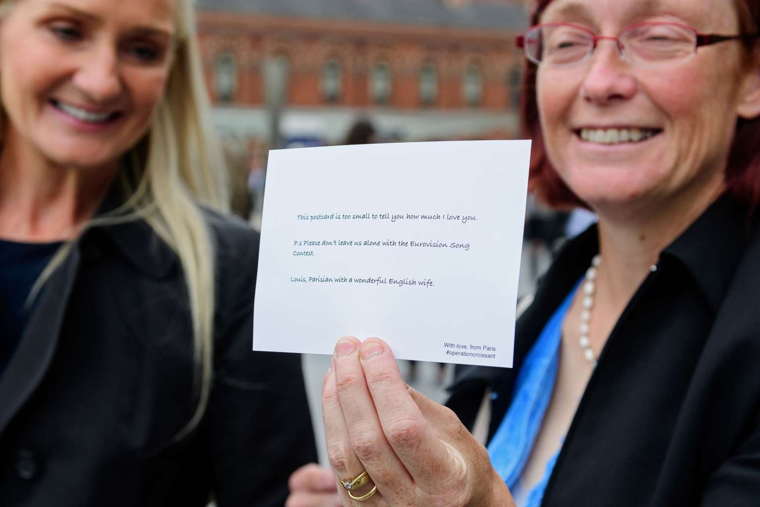 Deprived of their pastries, the activists handed out love letters - postcards with often handwritten messages they had collected from French nationals pleading with their cross-Channel friends to stay in the EU.