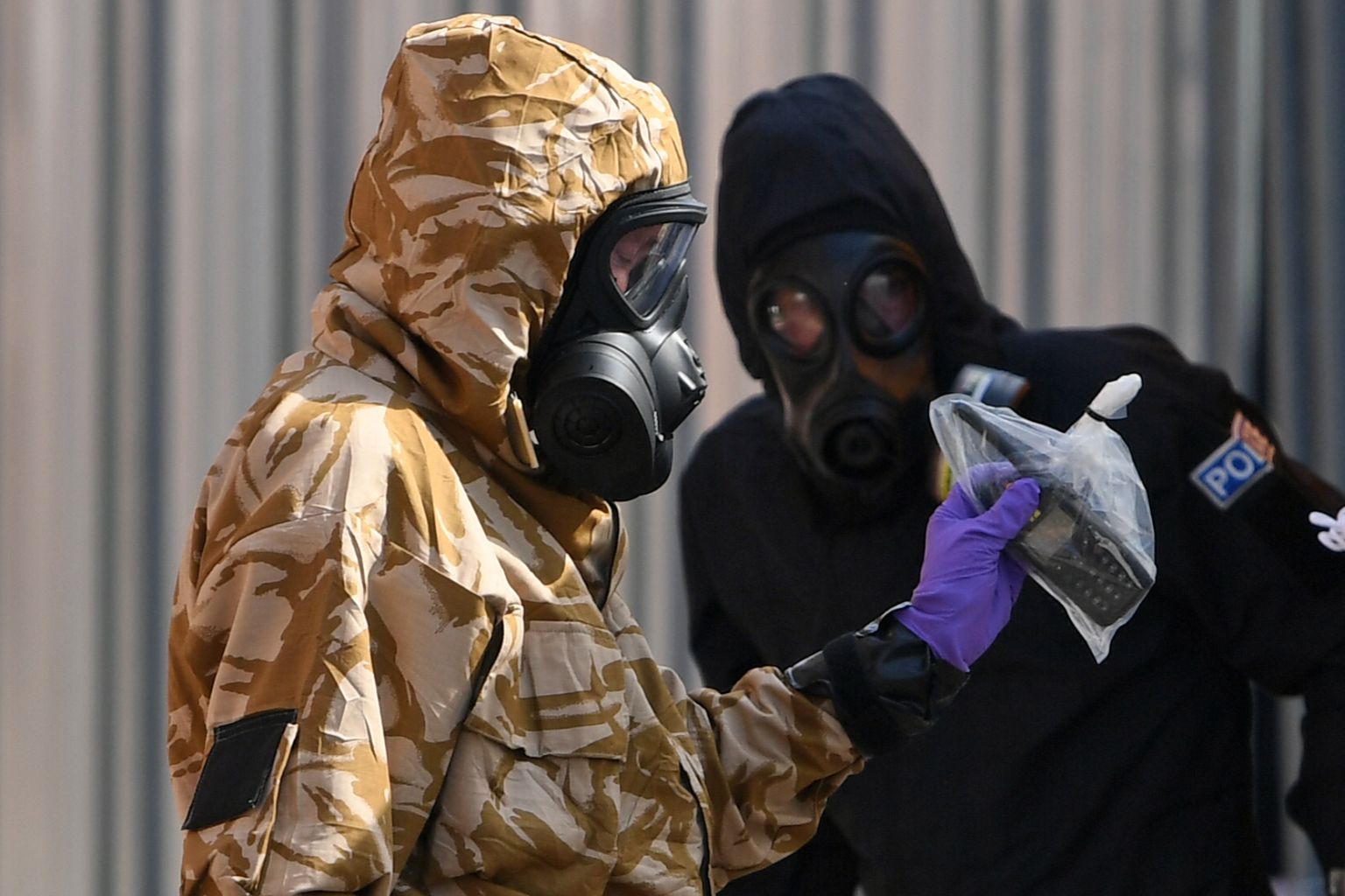 Investigators wearing camouflaged protective suits, gloves and gas marks work at a site in Amesbury, southern England, on July 6, 2018.