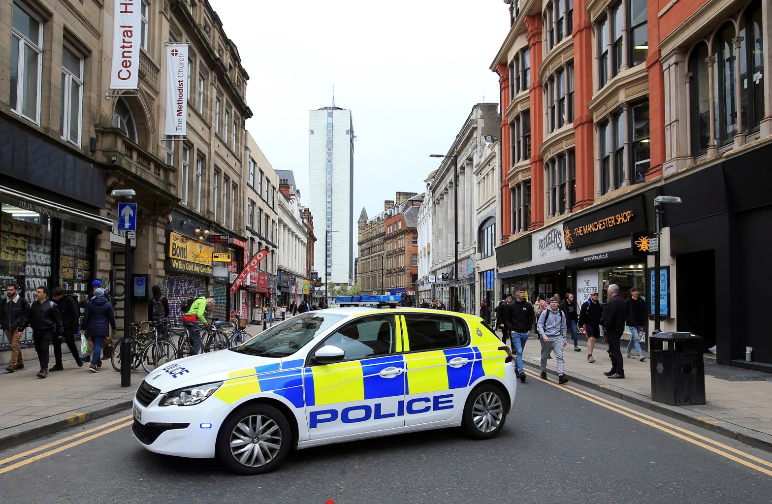 A police car blocks a street close to where a suspect package was found in Manchester.