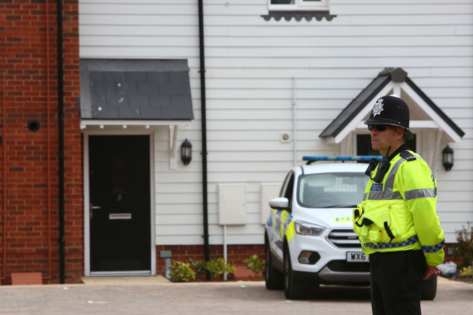 A police officer stands guard outside Charlie Rowley's house in Amesbury, southern England.