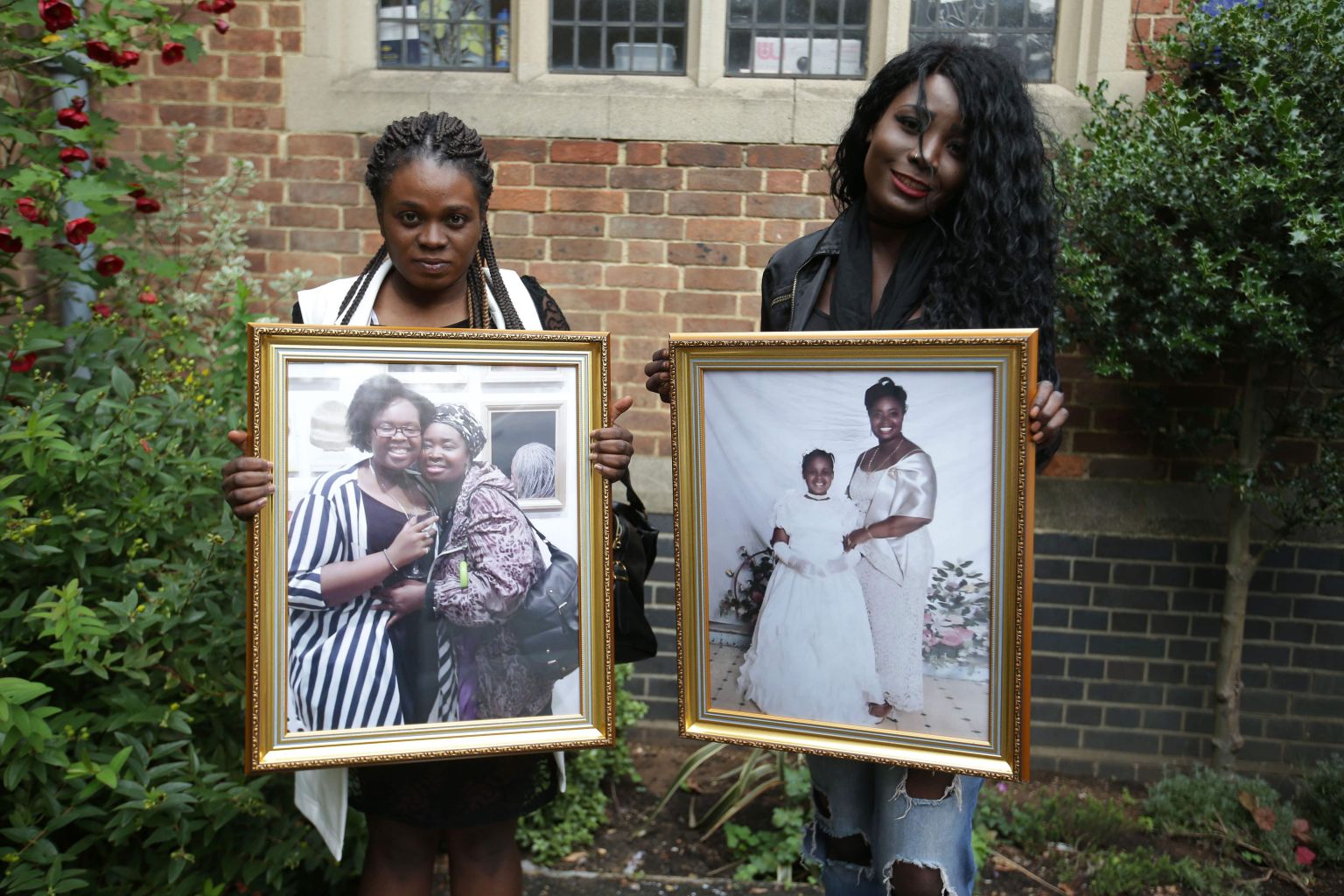 Relatives hold pictures at a memorial service for five of the Grenfell Tower fire victims, July 27, 2017.