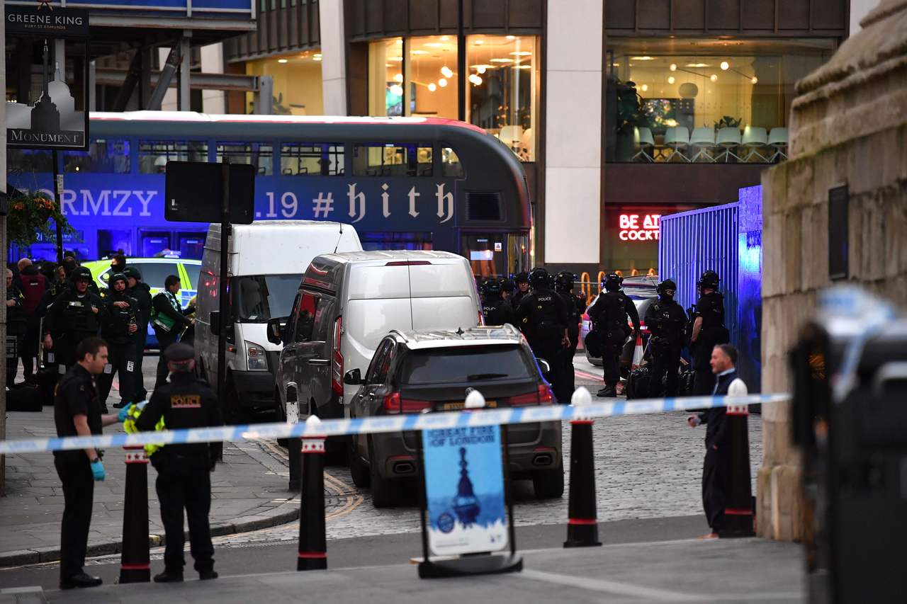 <p>Police gather near The Monument in central London, on November 29, 2019, after reports of shots being fired on London Bridge. - Armed police shot a man on London Bridge following a stabbing incident on Friday in which several people were believed to have been injured, reviving memories of a terror attack two years ago in which eight were killed. (Photo by Ben STANSALL / AFP)</p>