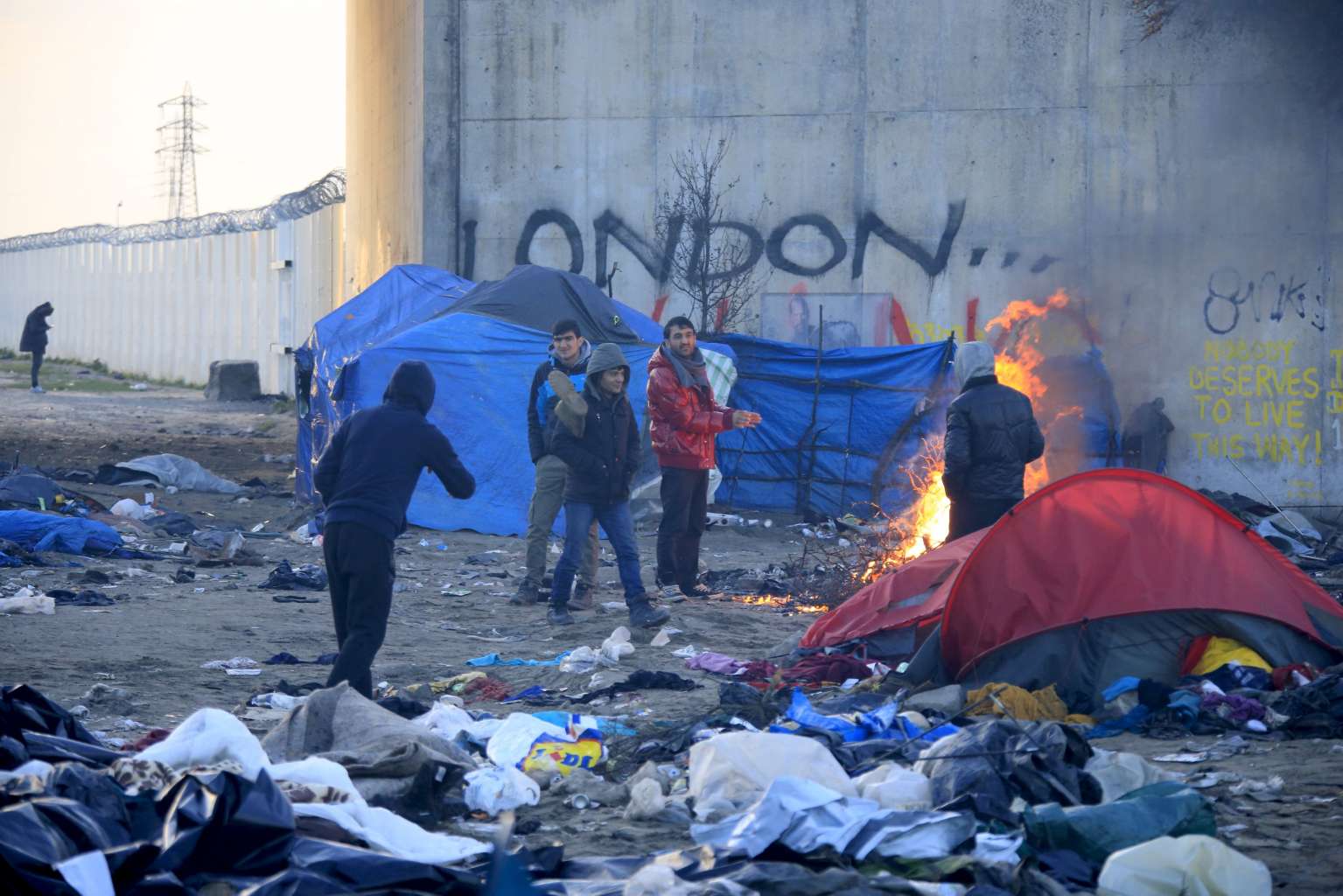 Migrants warm their hands near a wood fire in a dismantled area of the Calais camp known as "The Jungle".