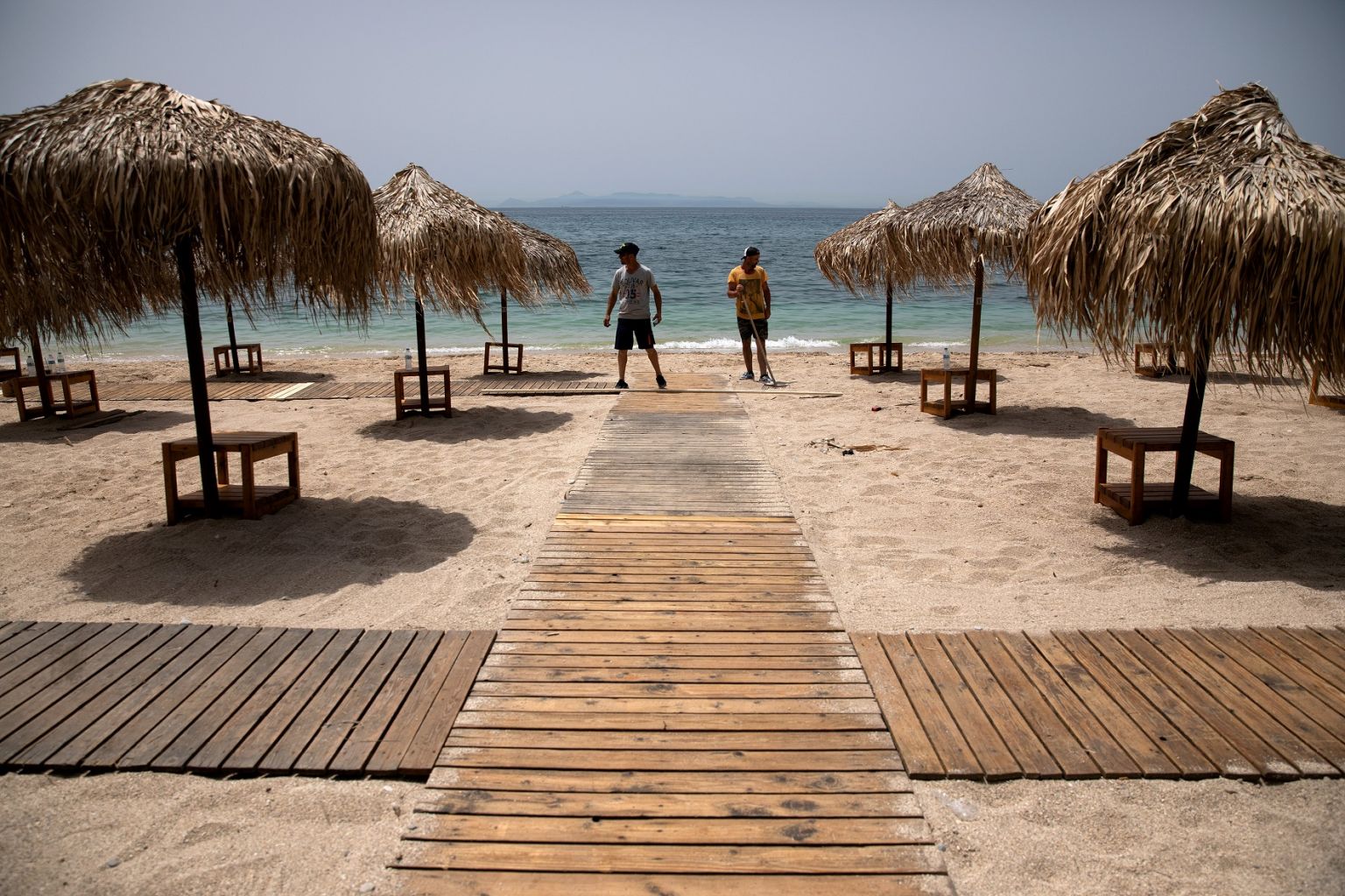 A May 2020 photo shows workers installing wooden corridors on a beach in Athens, Greece.