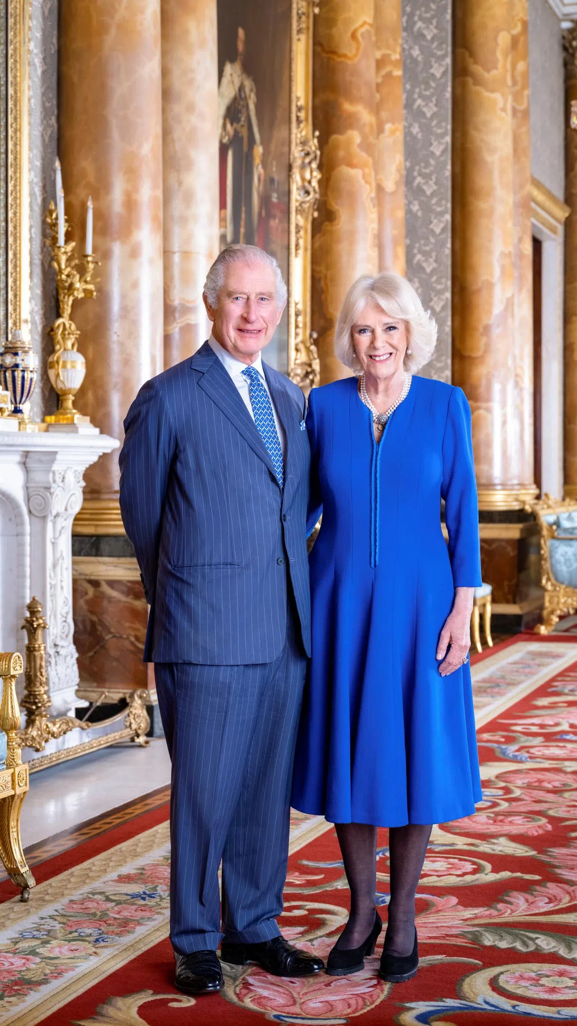 The King and Queen Consort appear in the new photographs sitting in front of a state portrait of King George V, who reigned from 1910 until 1936 and was the great-grandfather of King Charles.