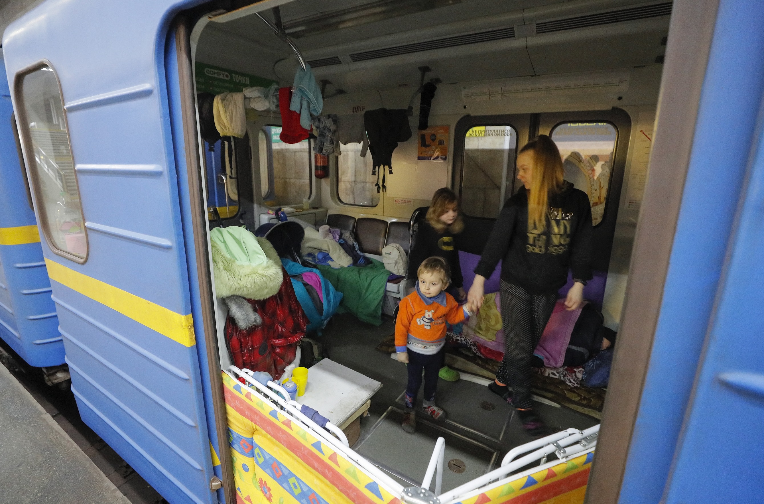Ukrainians take shelter inside a train cart at a metro station during the day in Kyiv, Ukraine. PHOTO: EPA-EFE
