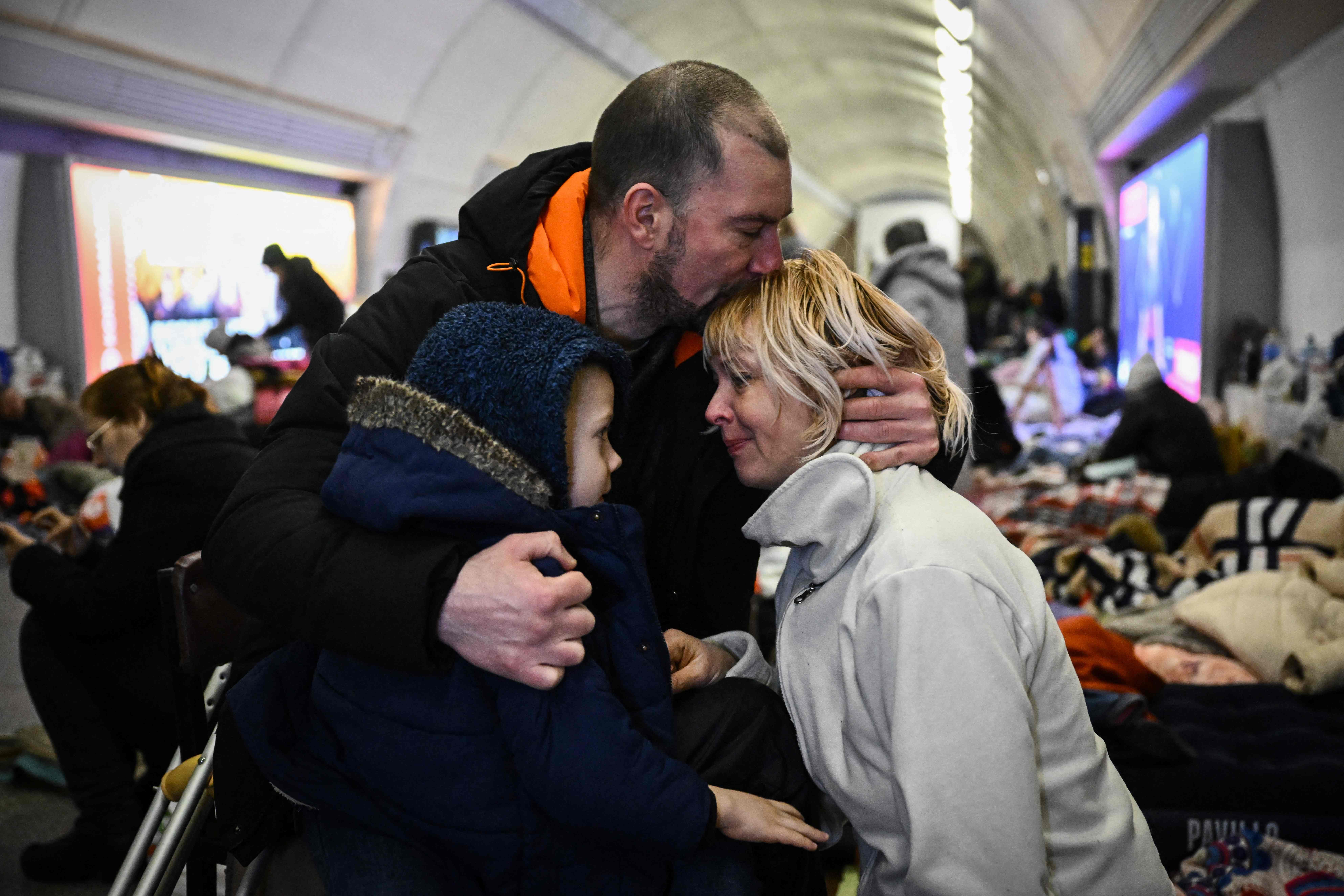 Sergyi Badylevych, 41, hugs his wife Natalia Badylevych, 42, and baby in an underground metro station used as bomb shelter in Kyiv, on March 2, 2022