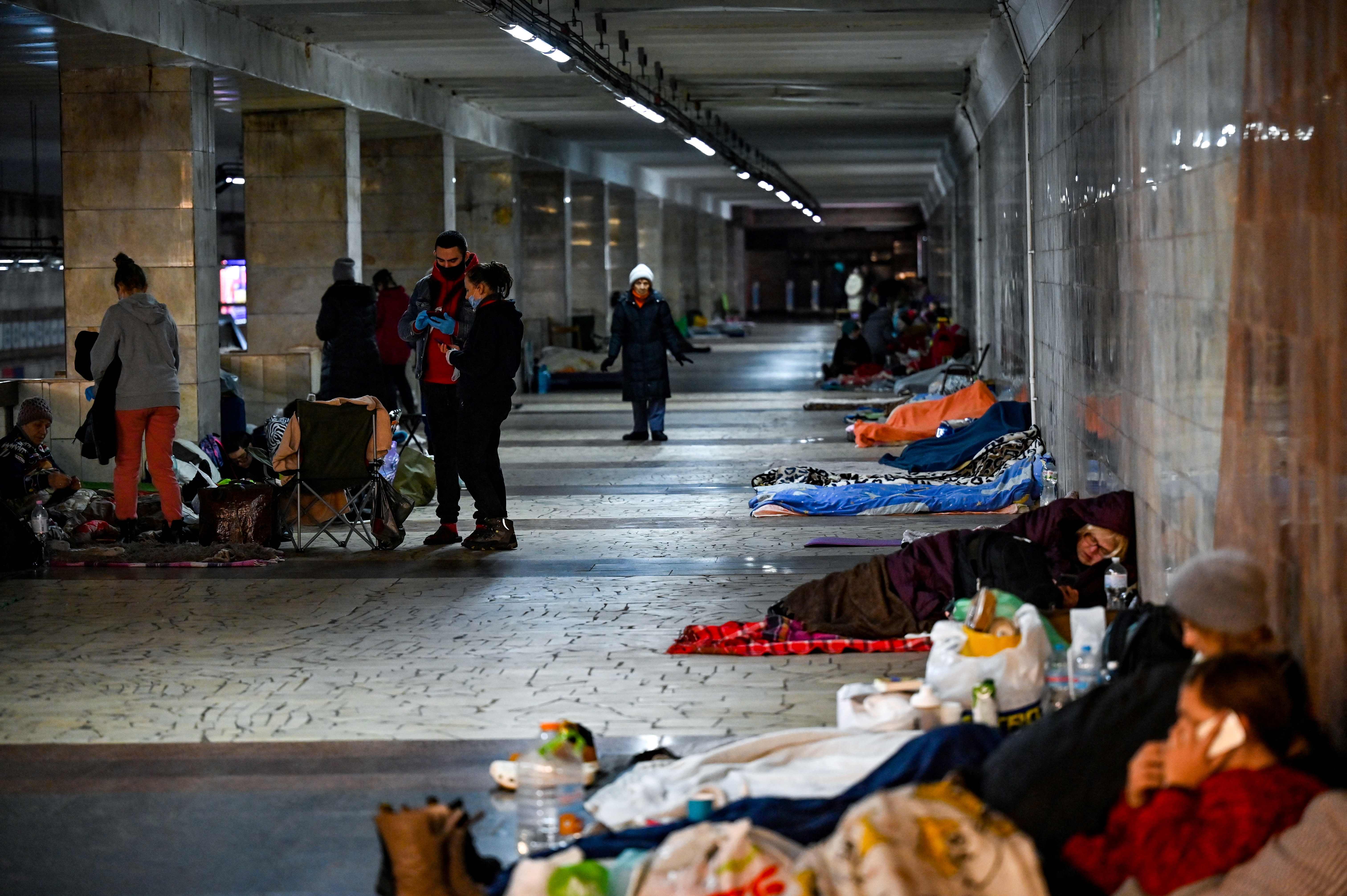 Civilians take shelter at an underground metro station in Kyiv on March 2, 2022. PHOTO: AFP