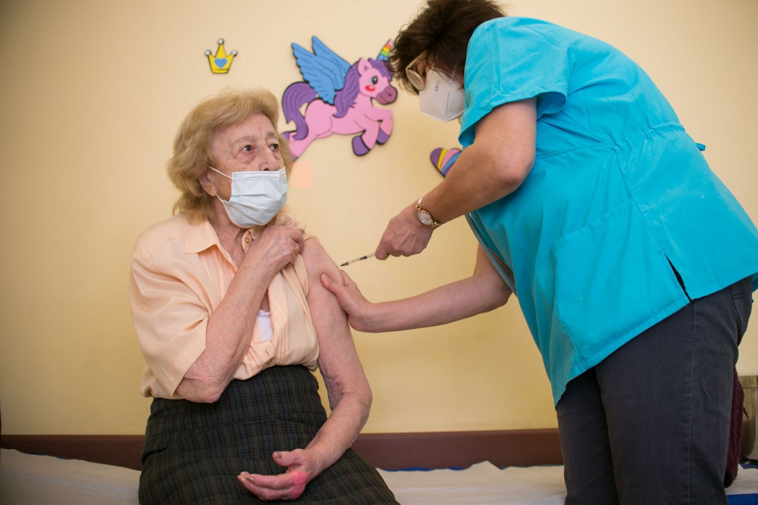 An elderly woman receives a dose of the AstraZeneca Covid-19 vaccine at the Pirogov Hospital in Sofia, on Feb 24, 2021.