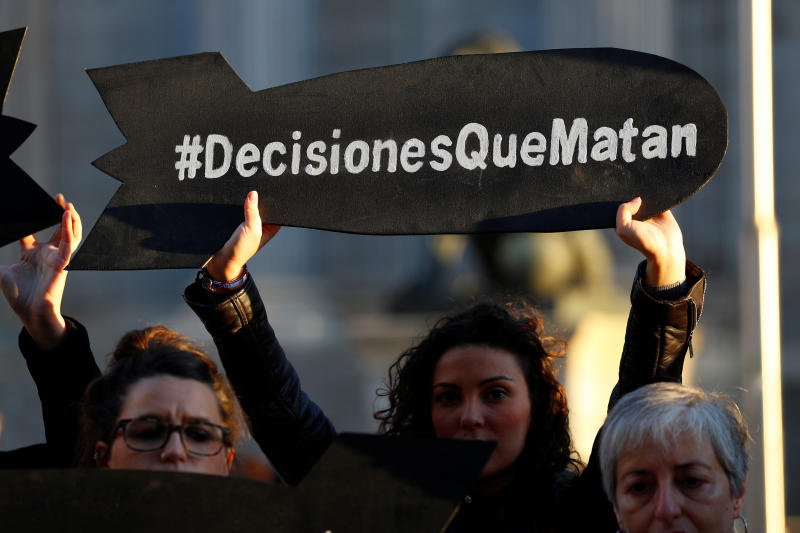 A protester holding a placard that says "Decisions that kill" during a demonstration to demand the halting of arms sales to Saudi Arabia, in Madrid on Oct 24, 2018.