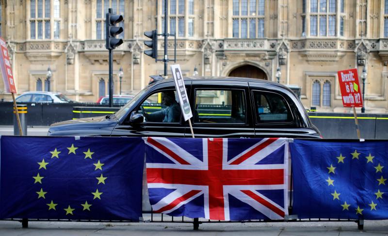 British and EU flags line the street during an anti-Brexit protest in London on Feb 12, 2019.