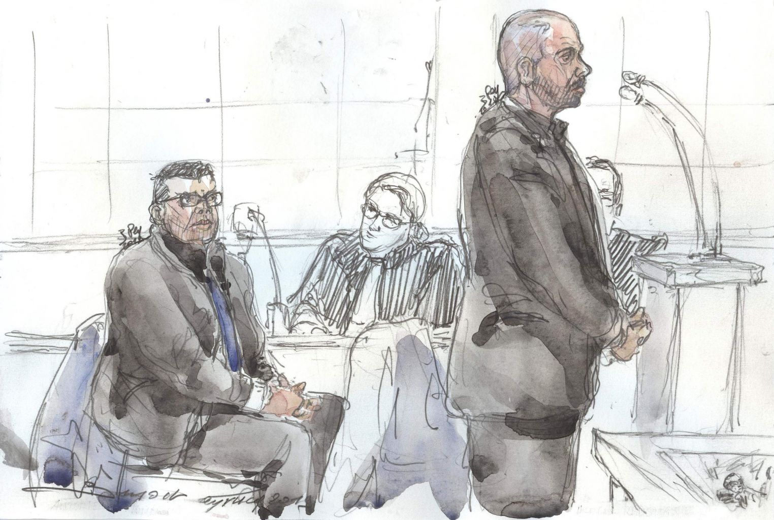 A court sketch shows accused police officers Antoine Q (left) and Nicolas R.