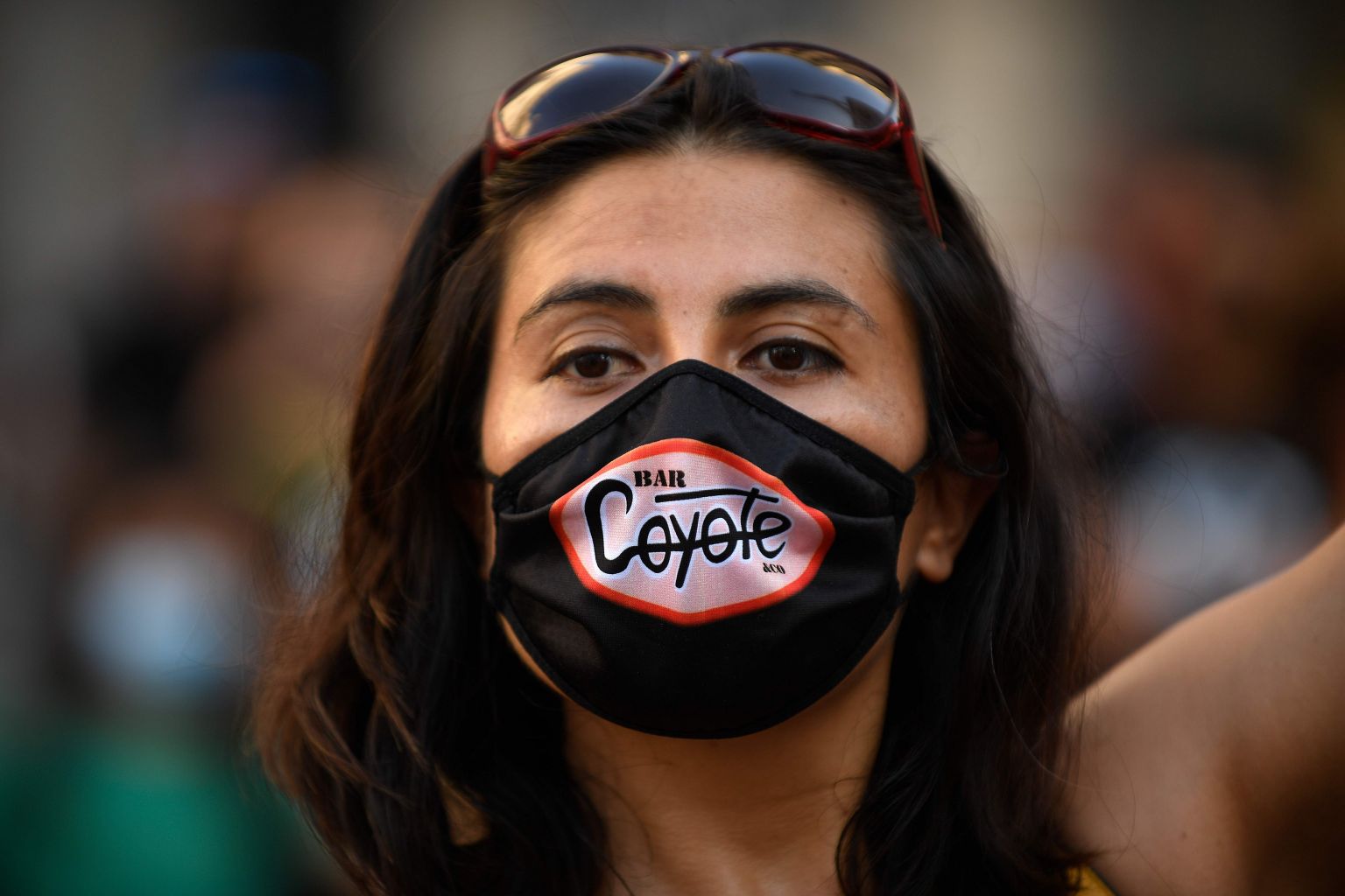A woman wearing a face mask with a bar logo takes part in a Barcelona protest against the closure of nightclubs and event halls after a surge in coronavirus cases.