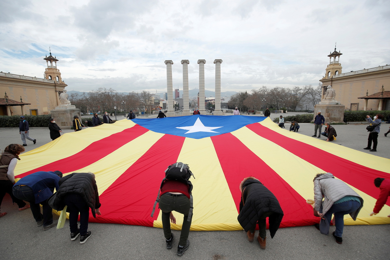 Protesters unveil a giant Estelada flag (Catalan separatist flag) ahead of the regional elections, in Barcelona, Spain, on Feb 12, 2021.