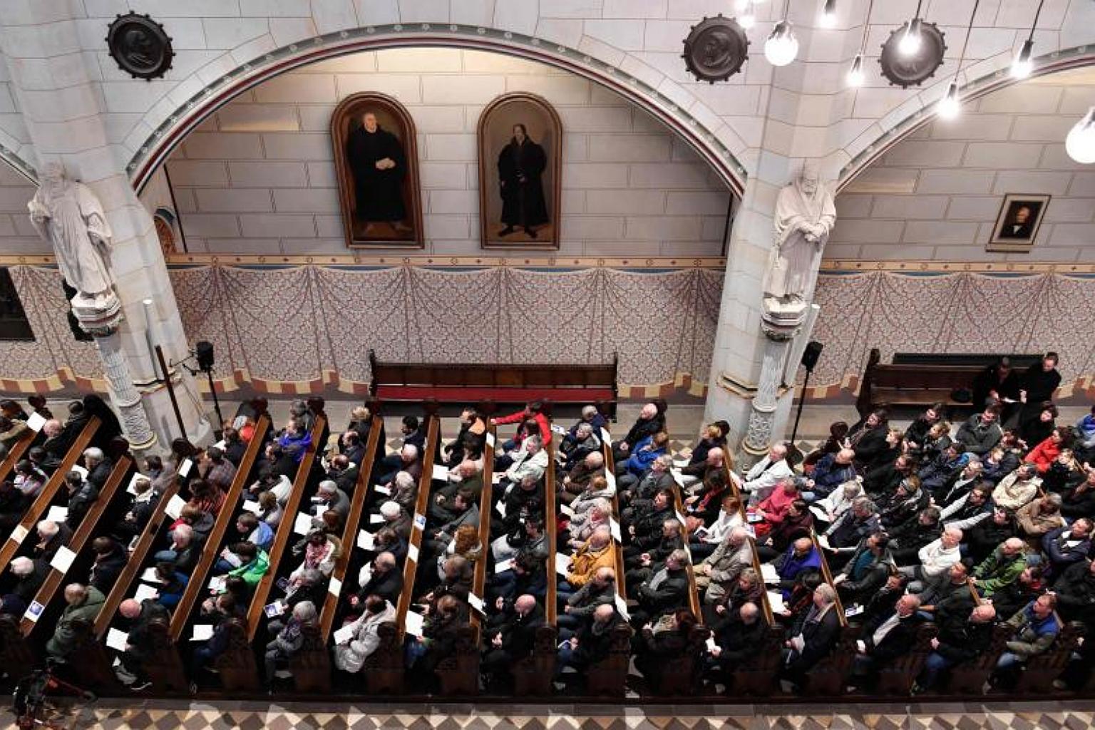 People attend a celebratory mass in the Schlosskirche under a portrait of German church reformer Martin Luther (top, left) on the occasion of the 500th anniversary of the Reformation on in Wittenberg, Germany on Oct 31, 2017