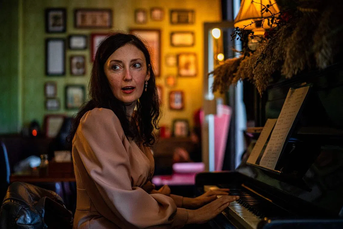 Musicologist Julia Kirkina sings and plays piano in a restaurant every Friday.
